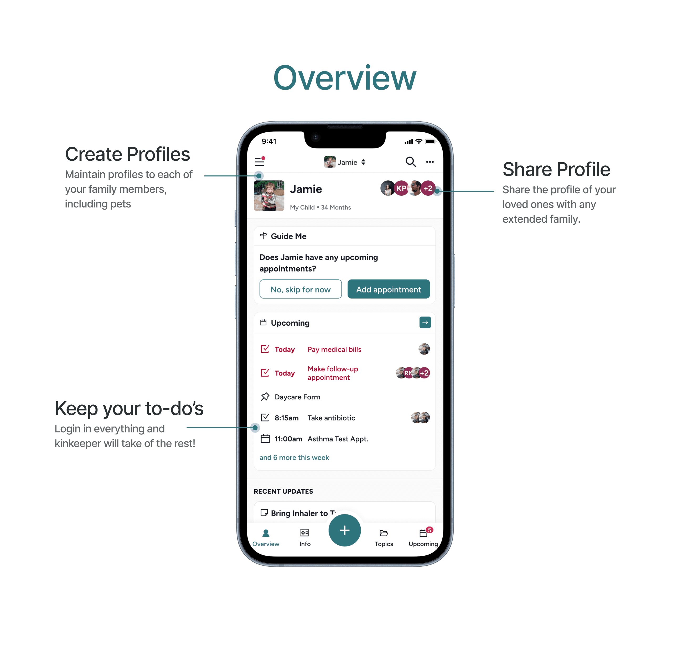 Kinkeeper is a family health coordination app designed to reduce the everyday burden of caregiving caused by busy families juggling medications, appointments, behaviors, and numerous small tasks, many of which get lost across Apple Notes, text threads, and memory.